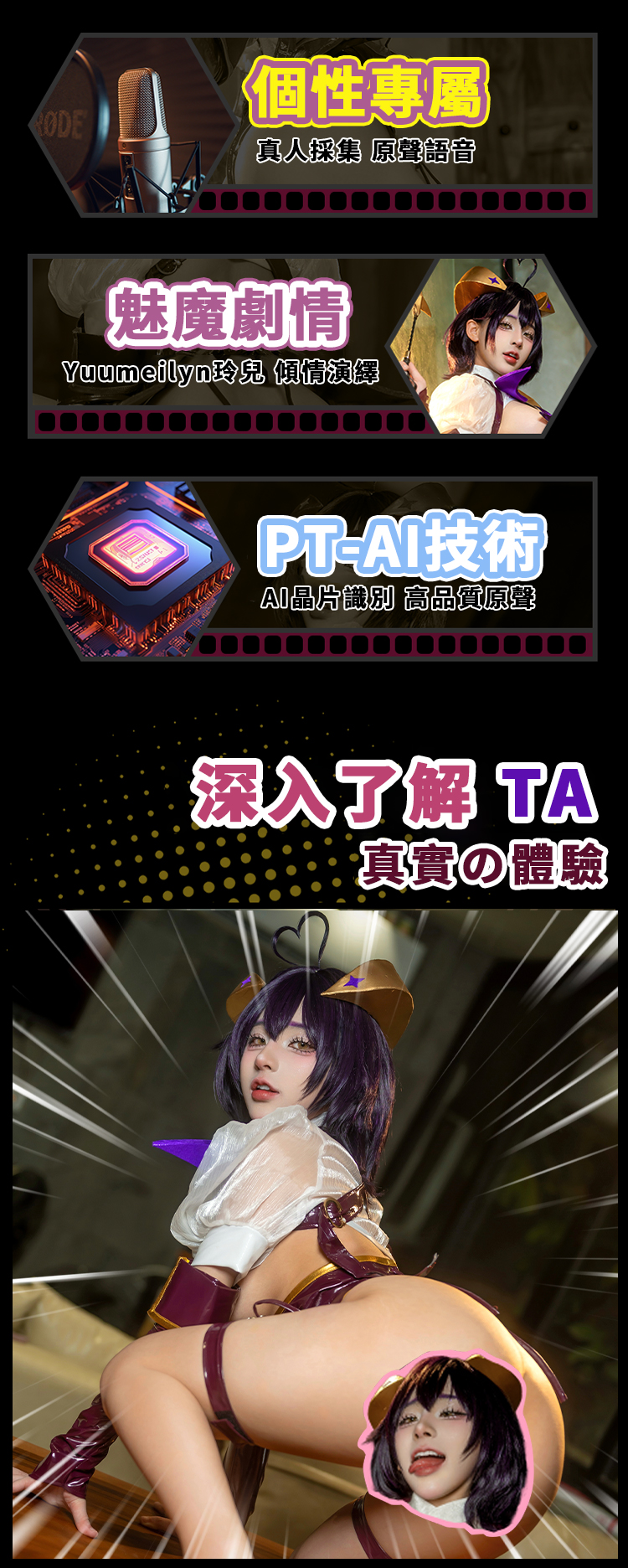 100%真人錄製,由聯名Coser玲兒親口錄製,包括嬌喘、哭腔、互動臺詞等。不是AI合成,是真實聲音。詳情頁試聽區已有片段可聽。